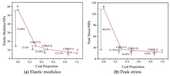 Peak stress and elastic modulus of single-rock sample, single-coal sample, and combinations.