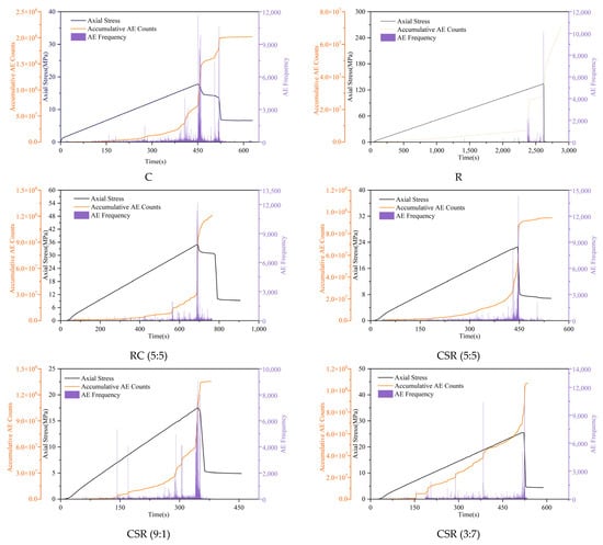 The relationship between axial stress, AE event frequency, and cumulative AE counts is illustrated in Figure 5. Different coal–rock ratio specimens exhibit similar AE characteristics, which can be divided into four stages. In the initial loading stage, both AE event frequency and cumulative AE counts are relatively low. This is attributed to the presence of inherent cracks and pore structures within the coal body, leading to compaction of the specimen. During this stage, inherent cracks within the coal body continuously close, and concurrently, with the decrease in coal content, the cumulative AE counts for samples C, CSR (9:1), CSR (5:5), CSR (3:7), and R are 17,698; 17,105; 14,703; 11,759; and 8821, respectively, accounting for 0.8%, 1.26%, 1.56%, 1.22%, and 1.24% of the total cumulative AE counts, respectively. This indicates that a higher coal–rock ratio corresponds to more initial microcracks within the coal sample, resulting in a greater number of AE signals released during compaction. As axial stress increases, the specimen enters the stage of elastic deformation, during which AE activity relatively intensifies, and cumulative AE counts exhibit an approximately linear growth trend. In this stage, initial microcracks within the coal sample are further compacted, and a small amount of cracking occurs. When the axial stress reaches around 75% of the peak strength of the specimen, the specimen gradually enters the yielding stage of progressive failure. During this stage, AE events become active, the AE count curve shows a “sudden change” fluctuation, AE counts become denser, several peaks appear, and cumulative AE counts almost vertically rise and reach their maximum near the peak stress. Numerous new cracks develop within the specimen, indicating the onset of macroscopic cracking and failure characteristics, accompanied by brittle sounds. After reaching the peak failure stage, axial stress rapidly decreases, causing the specimen to lose its bearing capacity. Cracks within the specimen gradually expand, forming macroscopic larger cracks, leading to continuous surface damage.