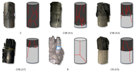 As shown in Figure 6, under uniaxial loading conditions, the single-coal specimen (C) exhibits significant tensile failure, with evenly distributed cracks on the coal surface, a fractured zone at the top edge, and a relatively intact overall morphology. When the proportion of coal in the combination is 90% (CSR (9:1)), the number of cracks on the coal surface increases; some cracks extend from the coal part to the rock part through the interface; and the number of cracks in the coal component decreases with the generation of interface effects, with no overall failure in the rock part. When the proportion of rock in the combination is 50% (CSR (5:5)), shear failure occurs in the primary coal–rock composite specimen, with the main crack penetrating the entire specimen through the coal–rock interface, and multiple cracks appearing in the rock part at the interface; the artificial coal–rock composite specimen exhibits clear tensile failure characteristics in both the coal and rock parts. When the proportion of rock in the combination is 30% (CSR (3:7)), the main cracks are distributed between the coal and rock; the integrity of the specimen is poor; and both the coal and rock parts of the combination exhibit fractured zones, with tensile failure occurring in the rock part, forming a macroscopic fracture zone. A single-rock specimen (R) exhibits only two main cracks with a large inclination angle, and the specimen undergoes overall shear failure.