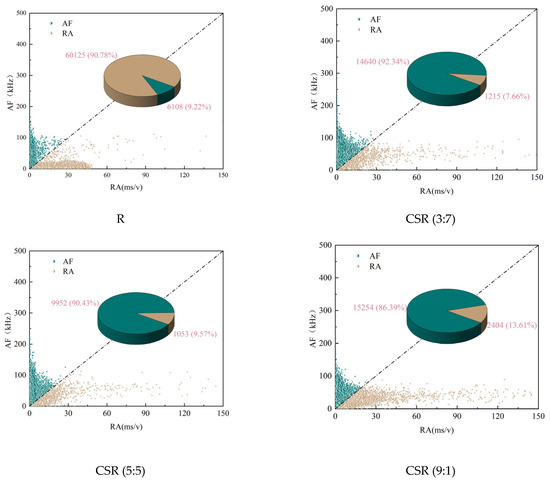 As shown in Figure 8, RA values mainly range from 0 to approximately 50 ms/v, while AF values mainly range from 0 to approximately 150 kHz, with the most data points near the origin. For a single-rock specimen, the proportion of RA values reaches 90.78%, showing low AF and high RA characteristics, indicating that during uniaxial compression, the main failure mechanism is the formation, development, and extension of shear cracks, corresponding to the macroscopic crack failure characteristics of the rock specimen described earlier, with two cracks appearing on the surface of the rock specimen exhibiting a large inclination angle, and the specimen undergoing shear failure overall. The acoustic emission signals of the single-coal specimen and the composite specimen mainly concentrate near the AF axis, showing clear high AF and low RA characteristics, indicating that tensile failure is the main factor leading to instability and failure. Moreover, as the proportion of coal increases, the proportion of RA values gradually increases, while the proportion of AF values decreases, indicating that shear cracks begin to form, develop, and extend inside the specimen, interconnecting with tensile cracks, eventually transitioning from tensile failure to tensile–shear composite failure.
