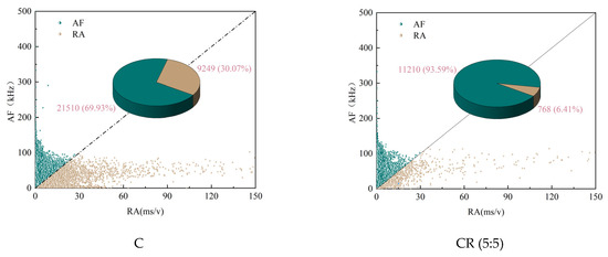 The following is an inversion of the sample’s failure characteristics based on the characteristics of the acoustic emission response. As mentioned earlier, when a uniaxial compressed specimen undergoes damage and instability, its failure modes mainly include tension failure and shear failure. Different failure modes exhibit different acoustic emission signal characteristics, thus allowing for the inversion of the failure mode of the loaded specimen through acoustic emission signals. Commonly used methods for acoustic emission inversion require parameters such as rise time, amplitude, ringing count, and duration [4]. RA represents the ratio of rise time to amplitude, while AF represents the ratio of ringing count to duration. RA and AF values constitute important parameters for crack model recognition. Tension failure generally exhibits high AF values and low RA values, while shear failure exhibits the opposite characteristics [24]. Therefore, through the characteristics of the acoustic emission signals, it is relatively simple to discriminate the failure mechanism of the specimen under stress loading, as shown in Figure 7.