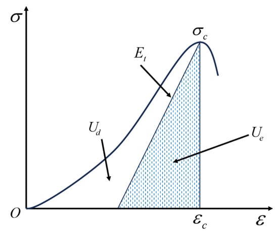 As shown in Figure 9, the input total energy during the stress loading process is the enveloped area under the stress–strain curve of the specimen, while the shaded area under the stress–strain curve represents the reversible elastic strain energy . The dissipated energy during the uniaxial compression process of the specimen is the area under the stress–strain curve, excluding the shaded region.