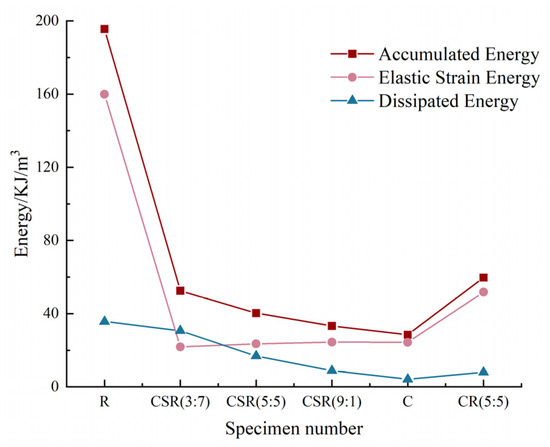 When the total accumulated energy of the specimen reaches the energy storage limit, the specimen exhibits failure. Therefore, the R specimen has the highest strength, corresponding to the highest total accumulated energy of 195.6 KJ/m3; the C specimen has the lowest strength, corresponding to the lowest total accumulated energy of 28.44 KJ/m3, which verifies the accuracy of the experimental results. The decrease in total accumulated energy with increasing coal content indicates that the critical failure energy of the specimen decreases linearly, and the increase in coal content reduces the energy absorption capacity of the specimen.