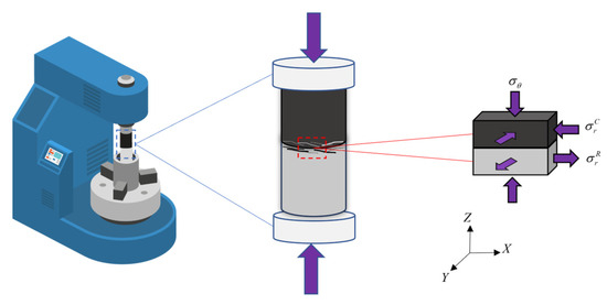 where and , respectively, denote the radial stresses experienced by the rock and coal bodies; represents the axial stress; and denote the elastic moduli of the rock and coal bodies, respectively; and and represent the Poisson’s ratios of the rock and coal, respectively. The schematic diagram illustrating the force distribution in the composite is shown in Figure 11.