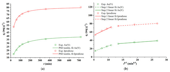 | Pseudo-second-order | k2 (g mg−1 min−1) | 4.18 × 10−4 ± 2.1 × 10−5 | 7.25 × 10−4 ± 3.1 × 10−5 |