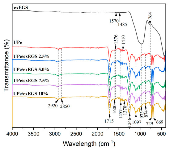3.5.3. Stabilization of Exhausted EGS@APTES-GT Material in UPe-Based Composites