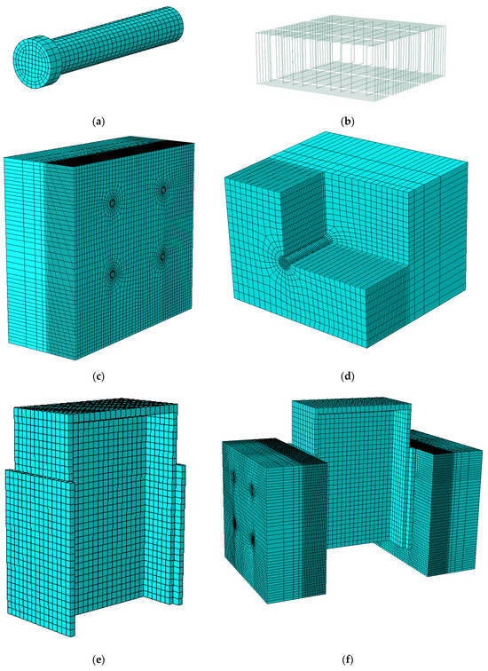 Details of the FE model and the meshing: (a) steel stud; (b) reinforcement; (c) concrete block; (d) details of the stud and surrounding concrete; (e) steel beam; (f) full of the FE model.