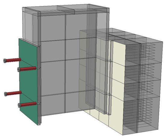 In the modeling process, ABAQUS was used. During the modeling, the program automatically generates a Python script for the given modeling task, which contains the steps required to complete the work. The goal of the modeling was to create a model that allows for extensive modifications and enables the examination of the questions presented in the literature review. In traditional methods, for example, relocating a stud, results in a considerable amount of modeling work (even 1–2 days), as this requires changes not only in the assembly module but also in the concrete geometry, since a hole must be created in the concrete where the stud is located. When such a change is made, it essentially requires restarting every step, such as geometry, assembly, loading, steps, interactions, and mesh. In such a complex model, manually modifying these kinds of changes can introduce many errors into the model. For this reason, other studies typically created only a few types of models and limited their examination to the effects of certain parameters. Our model was designed in such a way that the Python script generated during the design process can be easily modified and parameterized. In other words, a single change automatically updates the necessary model settings, ensuring that the model remains consistent in all aspects (e.g., mesh). Essentially, we have created a model in which any parameter can be simulated, such as stud placement, reinforcement bar locations, geometry, and materials.
