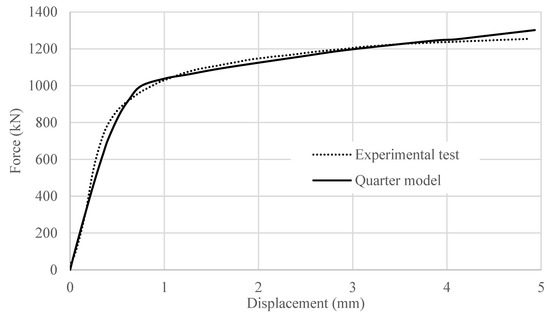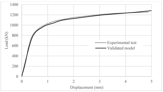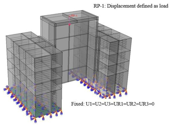During the modeling process, Newton–Raphson iteration was applied using a displacement-controlled approach, with nonlinear analysis and a nonlinear material model. External loads were applied through imposed displacements corresponding to the experimental test setup. Figure 5 presents the load and boundary conditions utilized in the FE model, which are identical to those implemented in the experimental test. The concrete part at the bottom were set as fixed.