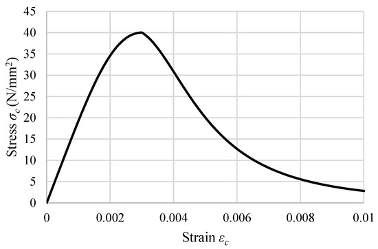 The compressive properties of concrete are presented in Figure 6, while the tensile properties are shown in Figure 7, both of which were utilized in the modeling process. The concrete damage plasticity (CDP) model is commonly used in finite-element (FE) modeling to accurately describe the nonlinear behavior of concrete, incorporating plastic deformation and damage under various stress conditions. The concrete damage plasticity model used in the current simulation is characterized by the following parameters: Poisson’s ratio of v = 0.2, Young’s modulus of E0 = 35,000 N/mm2, dilation angle of 33°, an eccentricity value of 0.1, a fb0/fc0 ratio of 1.12, and a viscosity parameter (K) of 0.667.