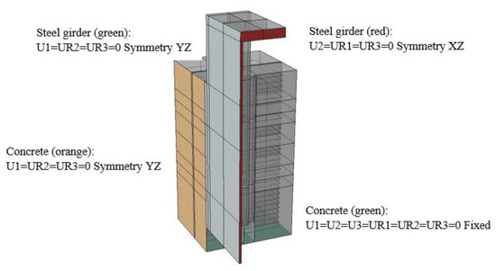 A mesh sensitivity analysis was conducted to evaluate the impact of mesh size on both computational accuracy and time efficiency. The results of mesh sensitivity analysis indicated the utilization of a finer mesh size at locations where high stresses were expected. At the applied mesh refinement level, the structural behavior could already be observed with high precision, and further refinements would not significantly alter the response but would considerably increase computation time. Finer meshes were employed in areas expected to experience high stress, ensuring greater precision in the results. Areas with significant expected deformations, such as the loaded steel girder, were also refined with finer meshes. As illustrated in Figure 3d, the stud and its adjacent concrete region were assigned the finest mesh. In the concrete, a more refined mesh was applied near the shank of the stud, extending to its endpoint. The finite-element boundaries along the stud and surrounding concrete were aligned to ensure convergence and accuracy in the simulation. Meticulous attention was given to maintaining complete symmetry of the mesh throughout the specimen. Appropriate separations and sets were used to create the most accurate mesh possible. The model’s mesh comprised roughly 867.012 variables in total.