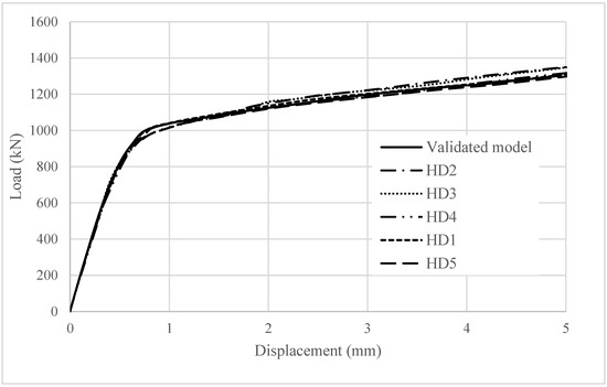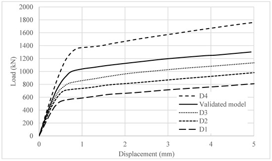 In the research, several variations were considered, including the geometry of the stud head. In the validated model, the head diameter was set to 31 mm, with the variations presented in Table 3. Figure 14 illustrates the results, where a negligible impact on the behavior of the steel–concrete connection was observed.
