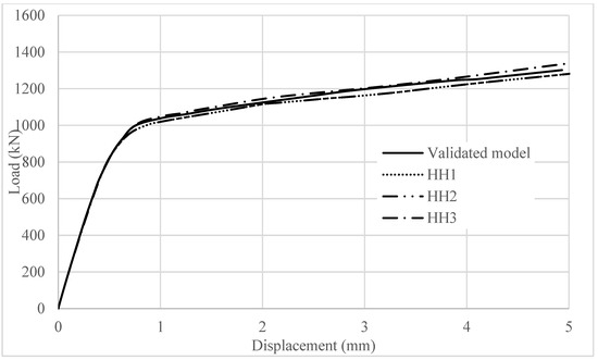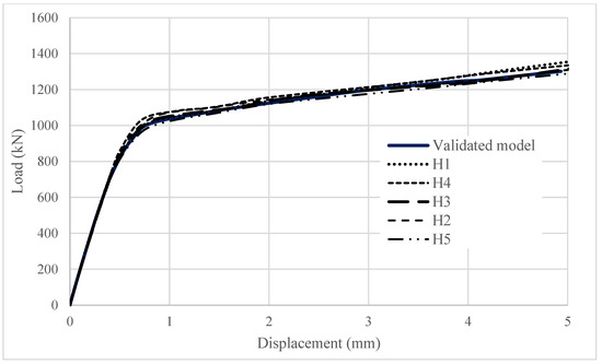 Several variations were examined in the investigation, as the height of the head of the stud. Table 4 summarizes these variations, with the stud height set to 31 mm in the validated model. The results, shown in Figure 15, indicate that the effects on the behavior of the steel–concrete composite structure were minimal.