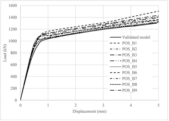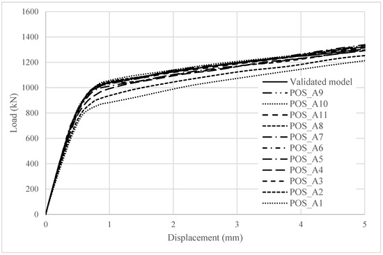Table 7 presents the variations in transverse spacing. In the validated model, this distance was 300 mm. Figure 17 demonstrates the influence of transverse spacing on the load–displacement behavior of the connection. It was observed that the highest value occurred with the closest spacing, and as the distances increased, the load capacities decreased accordingly.