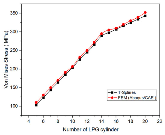 Figure 13 shows the variation in numerical Von Mises stress results in the curve according to the number of loaded cylinders, highlighting a close correlation between the FEM and T-Splines results, with a minor but consistent difference. The curve shows that starting from the weight of 15 cylinders, the elastic limit of the aluminum alloy 6061-T6 (298 MPa) is reached. We conclude that the storage capacity of a single cylinder is equivalent to 15 empty cylinders.