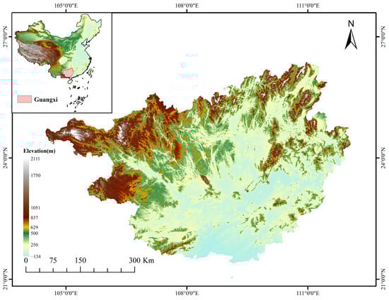 The Guangxi Zhuang Autonomous Region, situated in southern China, spans a geographical range of 20°54′ to 26°24′ N latitude and 104°27′ to 112°04′ E longitude, representing a typical mountainous zone in the region [10]. The topography is characterized by hills and low mountains with significant elevation variations. As illustrated in Figure 1, elevation distribution maps of China and Guangxi reveal an altitude range from −134 m to 2111 m, highlighting the region’s pronounced mountainous features, with roads frequently traversing these natural landscapes [11]. Influenced by a subtropical monsoon climate, Guangxi experiences high and concentrated precipitation, particularly during the rainy season, where intense rainfall often triggers geological hazards such as collapses, posing substantial risks to transportation safety and social development [12]. The interplay of complex geological conditions and diverse geomorphological features further heightens the susceptibility to collapse disasters. This study identified 10 primary collapse-influencing factors in the study area, encompassing critical elements such as topography and geology. By integrating topographic, climatic, and geological data, this study employs a convolutional neural network (CNN) model to synthesize multi-source data from the study area, aiming to enhance the prediction accuracy of collapse disaster risk and provide a scientific foundation for disaster mitigation and road planning [13].