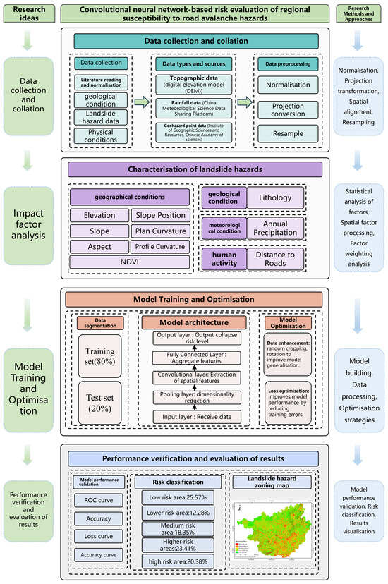 This study introduces a collapse disaster risk assessment model that leverages convolutional neural network (CNN) technology to evaluate collapse disaster susceptibility in the Guangxi Zhuang Autonomous Region. The technical roadmap for this model is outlined in Figure 2.