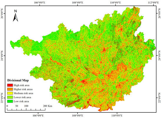 The spatial distribution characteristics of collapse disaster risks in Guangxi were demonstrated. The results show that the very high-risk and high-risk areas occupy about 43.8% of the total area of Guangxi, which is the main area for the development of collapsed hazards, and the density of the disaster sites is significantly higher than that of other areas, so it is necessary to focus on strengthening prevention, control, and management measures in these areas. In contrast, although the medium risk and below account for a larger area (56.2%), the density of disaster points is significantly lower, and the overall risk is controllable. Such distribution characteristics reflect the differences in risk under the combined effects of geology, climate, and human activities, further indicating that the very high-risk and high-risk areas need to be prioritized for disaster prevention, while the low-risk and very low-risk areas can appropriately adopt ecological restoration and other strategies to comprehensively enhance the level of regional safety.