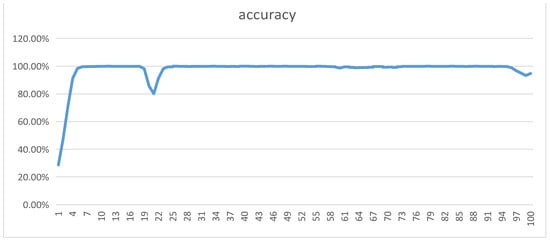 Figure 5 illustrates the accuracy curve of The ResNet18 model for road collapse risk assessment using multi-source remote sensing data, including slope gradient, lithology, vegetation coverage, and annual precipitation. The horizontal axis represents training epochs (unitless, ranging from 0 to 100), while the vertical axis denotes accuracy (expressed as a percentage, ranging from 0% to 100%), calculated by comparing model predictions with ground-truth labels using a test set comprising 20% of the road collapse points. The curve reveals that accuracy rises rapidly within the first 5 epochs, reaching approximately 80%, exhibits slight fluctuations and a brief decline around the 20th epoch, and subsequently stabilizes at approximately 90% by the 100th epoch. These approximate values reflect the model’s performance trend on the test set; results may vary if computed using other datasets (e.g., training or validation sets), indicating The ResNet18 model’s high classification capability and learning efficiency in this task.