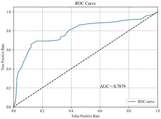 To quantify the classification performance of the model, this study further calculated the area under the receiver operating characteristic (ROC) curve (AUC), which ranges from 0 to 1, with values closer to 1 indicating superior classification performance. In this study, The ResNet18 model achieved an AUC value of 0.7879, demonstrating strong discriminatory ability. Although this value does not reach an exceptionally high level (e.g., above 0.9) and is lower than the peak accuracy of 90% observed on the test set, this discrepancy does not indicate an anomaly but rather reflects the inherent differences between AUC and accuracy as evaluation metrics: accuracy is based on a single threshold and may be inflated by imbalanced data distributions (e.g., a higher proportion of non-risk samples), whereas AUC integrates performance across all thresholds. In the task of road collapse risk assessment using multi-source remote sensing data—including slope gradient, lithology, vegetation coverage, and annual precipitation—the AUC is constrained by data complexity and noise, making values above 0.9 challenging to attain. Combined with the training performance in terms of loss rate and accuracy, an AUC of 0.7879 still confirms the reliability and applicability of The ResNet18 model for road collapse risk assessment [41].