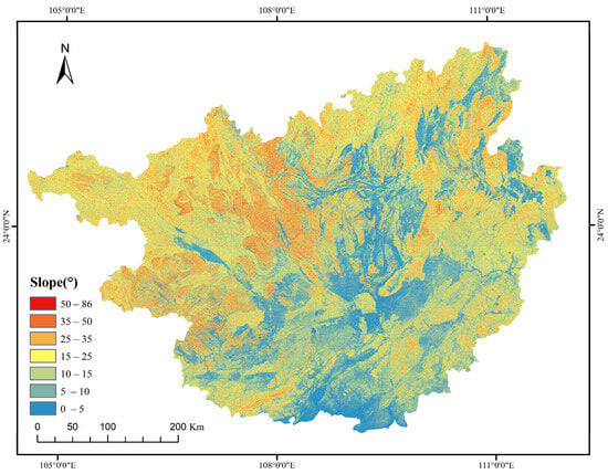 This figure illustrates the slope classification for the Guangxi Zhuang Autonomous Region, based on the ASTER GDEM digital elevation model (DEM) with a resolution of 30 m sourced from the Geospatial Data Cloud platform. Slope values were extracted from elevation data using geographic information system (GIS) techniques and were classified using the Natural Breaks method [7,29]. The classification intervals are defined as: 0–5°, 5–10°, 10–15°, 15–25°, 25–35°, 35–50°, and 50–86°. The natural breaks method optimizes within-group variance minimization and between-group variance maximization based on the distribution characteristics of slope data. Regions with steeper slopes (e.g., 50–86°) are categorized as high-risk zones due to reduced soil stability and increased vulnerability to collapse disasters, while gentler areas with slopes less than 10° are categorized as low-risk zones. This slope classification is a key input to the susceptibility risk assessment model based on a convolutional neural network (CNN), providing essential support for disaster prevention and regional planning.