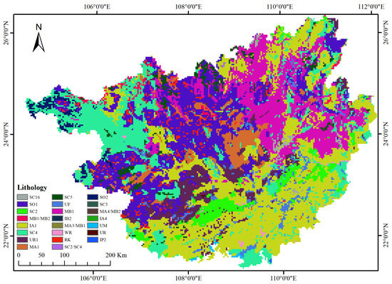 This figure illustrates the lithological distribution in the Guangxi Zhuang Autonomous Region, generated based on geological surveys and geospatial data, highlighting the rock types influencing soil stability and collapse risk. The lithological classification includes sedimentary rocks (SC16, SC5, SC4, SC2, SC3, SC1, SO1, SO2), varying in hardness and fracturing degree, with softer or more erodible types exhibiting increased collapse risk under rainfall conditions; metamorphic rocks (UF, MB1, MB2, MA4/MB2, MA3/MB1), characterized by pronounced fracturing, resulting in reduced stability; and igneous rocks (IB1, IB2, IA4, IA1, UM), which generally resist weathering and exhibit high cohesion, though highly fractured or weathered igneous rocks (UR, WR, RK, IP2) are prone to collapse [26]. Softer lithologies show a significant correlation with higher collapse risk, a conclusion further validated by the model’s predictive results.
