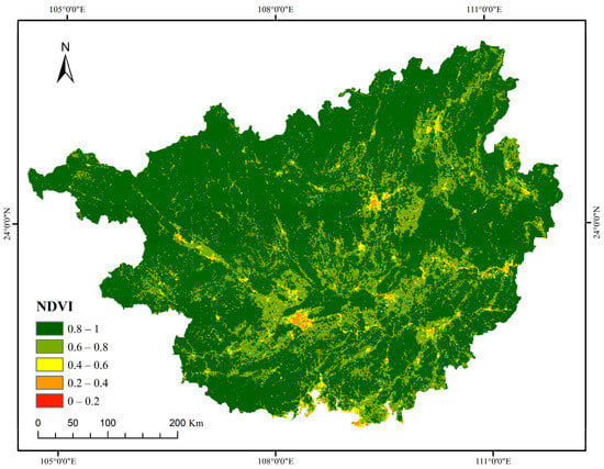 This figure illustrates the distribution of the Normalized Difference Vegetation Index (NDVI) in the Guangxi Zhuang Autonomous Region, generated based on remote sensing data [10]. The NDVI values and their implications are as follows: values below 0.2 indicate water bodies or bare surfaces with a high risk of erosion; 0.2 to 0.4 correspond to sparse vegetation with low stability; 0.4 to 0.6 represent moderate vegetation density with a reduced erosion risk; 0.6 to 0.8 denote dense vegetation with a low collapse risk; and values above 0.8 signify extremely dense vegetation, capable of significantly stabilizing soil under varying rainfall conditions.