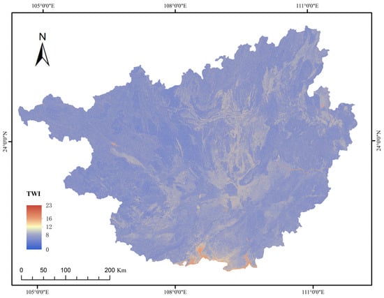 This figure illustrates the distribution of the Topographic Wetness Index (TWI) in the Guangxi Zhuang Autonomous Region, generated based on digital elevation model (DEM) data and hydrological analysis [7]. The TWI values and their implications are as follows: values below 8 indicate strong runoff zones, located on steep slopes and ridges, with high soil stability and low collapse risk due to limited water accumulation; values from 8 to 12 represent transitional zones, situated on gentle slopes and terraces, with moderate stability and intermediate risk; values from 12 to 16 denote shallow soil water saturation zones, found in valley bottoms and gullies, with reduced stability and increased collapse risk due to significant water accumulation; and values above 16 signify surface water convergence zones, located in river channels and wetlands, with high soil moisture, markedly reduced stability, and substantially elevated collapse risk.