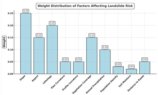 As can be seen from the figure, the slope has the largest weight, indicating that the slope has the most significant effect on the risk of collapse. Soils in high-slope areas are less stable and prone to sliding and collapse, so the weight of the slope factor was ranked first among all factors. The lithology factor followed closely, with a high weight, indicating that the physical properties of rocks (e.g., hardness, weathering resistance) directly affect the stability of the soil body, and the risk of collapse is higher, especially in areas with soft rocks or fissure development. In addition, the weight of vegetation cover was equally high, indicating that vegetation plays an important role in reducing the risk of collapse. In particular, in areas with better vegetation cover, the stability of the soil body is enhanced. The weight of the precipitation factor was also higher; in areas with high precipitation, the soil body is affected by water saturation and is easily destabilized, thus increasing the risk of collapse. The graphs also show that some other factors, such as the aspect, curvature, population size, soil moisture, and distance from roads, have relatively low weights, but they play an auxiliary role in predicting the results of collapse hazards by combining to influence the stability of geological conditions.