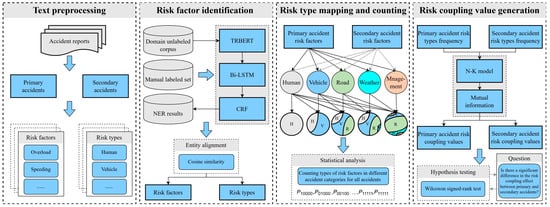 In current accident analysis methods, such as Accident Mapping Analysis (AcciMap) [8], the Human Factors Analysis and Classification System (HFACS) [9], and the Systems Theoretic Accident Model and Process (STAMP) [10], an important preliminary step is the identification of hazards, accident causes, risk factors, and other related entities. This typically requires a thorough manual review and analysis of accident investigation reports, followed by the extraction of relevant entities [11,12], which is also referred to as an expert-based method. For example, Zhang et al. [13] used HFACS, with the help of research teams from universities and transportation companies, to categorize accident causes into five categories: unsafe behaviors, preconditions for unsafe behaviors, unsafe supervision, organizational influences, and outside factors. Stanton et al. [14] organized two human factor analysts, each with a Ph.D. and 30 years of experience, to categorize 37 accident investigation reports into 19 categories, identifying 1656 contributing and protective factors for road safety interventions. However, although this method can extract factors with relatively high accuracy, as the accident dataset continues to grow, it can lead to additional labor costs.