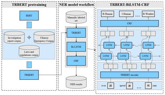 Extracting risk factors from unstructured text is a critical step in analyzing risk coupling relationships. NER is a widely studied and well-validated task in the field of NLP. Among them, the BERT-BiLSTM-CRF framework has shown superior performance on multiple datasets and has been proven to be superior to other frameworks in NER tasks [34,40]. For high-precision extraction and identification of risk factors in the two ACs, we optimized the BERT-BiLSTM-CRF framework, as shown in Figure 2. Specifically, BERT is a language representation model based on a transformer encoder that can convert text into word embeddings and sentence embeddings [39]. However, since its pretraining is based on general-purpose corpora, its performance in understanding accident risks still has room for improvement. To this end, we performed continued pretraining on BERT using an accident-risk-specific corpus, resulting in the TRBERT model and the TRBERT-BiLSTM-CRF framework. The framework is capable of semiautomatically extracting risk factors and identifying risk types from accident reports, thereby reducing the cost of subsequent risk factor identification.