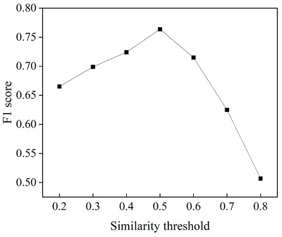 The trained and optimized TRBERT-BiLSTM-CRF model was applied to PA and SA reports to extract risk factors and risk types, respectively. Subsequently, a sensitivity analysis of the similarity threshold was conducted. Specifically, we manually labeled 600 pairs of risk factors to evaluate the F1 score at different similarity thresholds and determine the optimal threshold. Figure 4 shows the F1 score at different similarity thresholds. The results showed that a similarity threshold of 0.5 yielded a higher F1 score and accurately distinguished risk factors. Additionally, we found that, compared with higher thresholds, lower thresholds achieved higher F1 scores, which could be attributed to the presence of many entities in the dataset that had low similarity but were still correctly matched.