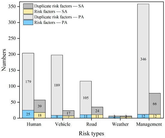 On this basis, the similarity threshold was set to 0.5, and redundant risk factors were removed using the cosine similarity method. Figure 5 presents the entity deduplication results for the five risk types in PA and SA. The redundancy of the “management” risk type was the highest, possibly because the associated risk factor descriptions were relatively vague and frequently mentioned. Finally, 61 and 45 risk factors, along with five risk types, were extracted from PA and SA, respectively, as listed in Table A1 and Table A2 in Appendix A.