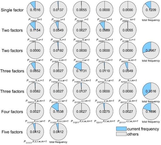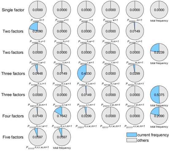 As discussed in the previous section, the risk factors and their corresponding risk types were extracted for each accident sample. Then, a binary mapping of risk types was applied to each sample in different ACs, with duplicate risk types removed. This involved assigning values of 0 or 1 to , , , , and , resulting in a five-bit encoding. For example, given an accident sample in PA, if the accident involved only human factors, then , , , , and . The status encoding for H, V, R, W, and M was “10000”. By performing binary mapping on all accident samples in PA and SA, the risk type status encoding for each accident sample was obtained, and the quantity and frequency of the status encodings were counted. Figure 6 and Figure 7 show the frequencies of different risk type status encodings in PA and SA, respectively.