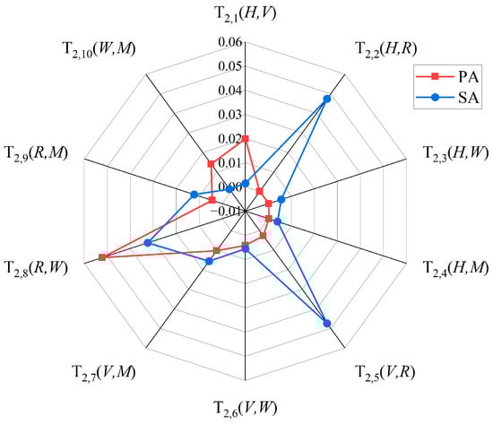 The Wilcoxon signed-rank test, proposed by F. Wilcoxon, is a nonparametric statistical test method [59]. The Wilcoxon signed-rank test determines whether the differences between two paired samples are statistically significant by comparing the signs and ranks of the differences. This method was developed based on the sign test for paired observational data, offering greater efficiency compared to the traditional test that relies solely on positive and negative signs. In the previous section, we can calculate the risk coupling values for different coupling types in both PA and SA. Importantly, the coupling scenarios in PA and SA are identical, forming paired samples. For example, in both PA and SA represents human–vehicle coupling. Therefore, we applied the Wilcoxon signed-rank test to compare the 26 risk coupling values in PA and SA and tested two hypotheses: