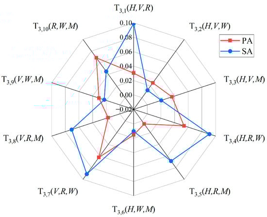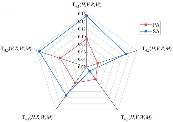 As shown in Figure 6, the risk types in PA were generally balanced. Specifically, in accident samples involving a single risk type, accidents with the status encoding “10000” occurred most frequently, while accidents with status encodings “00010” and “00001” had frequencies of zero. This indicates that isolated weather and management factors do not lead to accidents. An interesting phenomenon was that, for accidents involving four risk factors, the combination of human, vehicle, road, and management factors (status encoding “11101”) occurred most frequently, while the combination without human factors (status encoding “01110”) occurred at a much lower frequency. This suggests that human factors may be the primary driving force behind the occurrence of accidents. The same phenomenon was also observed in SA, as shown in Figure 7. In SA involving three risk factors, the combination of human, vehicle, and management factors (status encoding “11001”) occurred most frequently, while the combination of only vehicle and management factors (status encoding “01001”) occurred with a frequency of only 0.0192. In addition, nearly half of the accident samples involved three risk types in SA. This was also a key difference between PA and SA.
