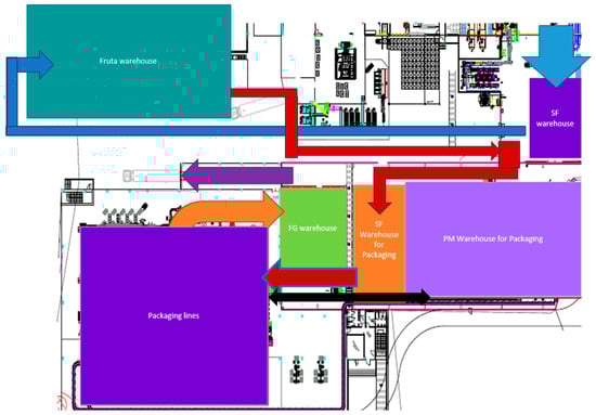 An inseparable component of material flow is the information flow, which plays a key role in ensuring the efficiency and continuity of the entire logistics chain [7]. Information flow provides essential data for monitoring, planning, and coordinating material movements, thereby supporting decision making and process optimization [8,9]. Within the broader framework of logistics and supply chain management, material flow optimization aligns with lean logistics principles, reducing waste and improving efficiency through just-in-time (JIT) inventory strategies and streamlined production planning [10]. Furthermore, supply chain resilience depends on the adaptability of material flows to external disruptions, highlighting the importance of predictive analytics, real-time tracking, and automation in modern logistics operations [11].