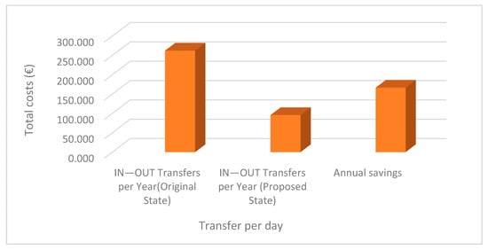 An alternative solution to reduce transportation costs involves acquiring an in-house fleet of transport units, thereby reducing dependence on an external operator. This approach does not directly optimize the material flow, but rather reduces transportation costs, which constitute a significant portion of the overall expenses when allocated across individual transport operations. Implementing this strategy would result in cost savings of EUR 166,974.63 on SF transport. Figure 7 illustrates the transportation costs associated with SF.