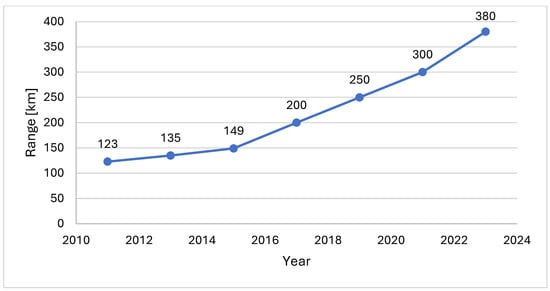 Evolution of average range of BEVs (adapted from [2]).
