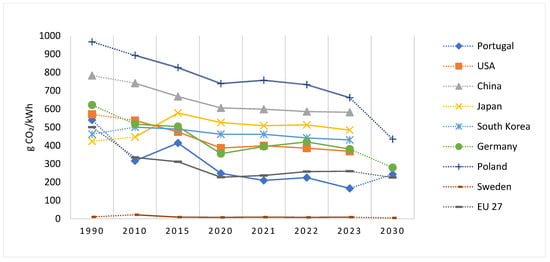 Carbon intensity over the life cycle of the electricity grid in different countries, 1990–2023 (adapted from [23]).