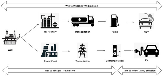 WTT refers to the processes required to convert crude oil from the wells at the fuel depot into usable petrol or diesel fuel, and TTW refers to combustion in the engine, as shown in Figure 6. This terminology has also been adopted for BEVs, with WTT referring to all impacts of electricity generation that occur prior to vehicle charging, and TTW referring to the direct impacts of driving the vehicle [5].