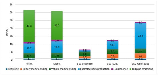 In Poland, which has one of the most carbon-intensive grid energy mixes in Europe (mostly due to coal), a BEV was still 26% and 28% cleaner than a diesel-powered or petrol-powered ICEV, respectively, as can be ascertained from the values in Figure 7 and Figure 8.