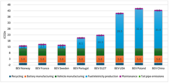 The carbon intensity of the electricity used to charge a BEV has a significant impact on its overall CO2e emissions. In the current study, it was assumed that the battery was produced using the average global value, around 97 kg CO2e for each kWh of battery [9] (see Figure 8).
