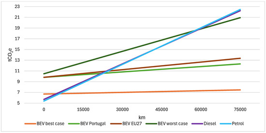 Table 10 shows the mileage required for BEVs to reach environmental parity with diesel and petrol ICEVs in Portugal in the various scenarios in Figure 9.