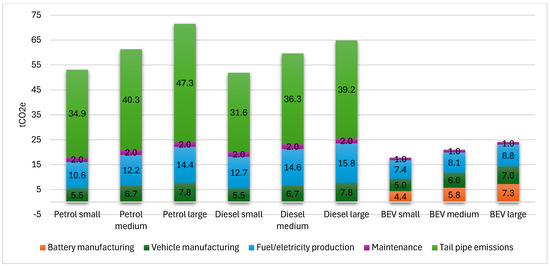 The average vehicle’s fuel and energy consumption values vary according to the size of the vehicle (small, medium, or large), influencing the operational emissions throughout the vehicle’s useful life (see Table 6).