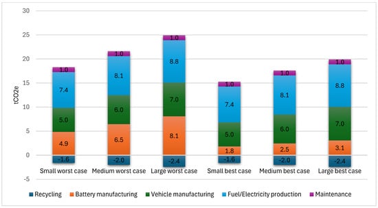In Figure 11, carrying out the same calculations but for BEVs in Portugal in the best- and worst-case scenarios and considering the segment and location of battery production. The analysis considered the production of BEV batteries. In the best-case scenario, the batteries produced in Sweden had a carbon intensity of 45 kg CO2e/kWh, while in the worst-case scenario, they were manufactured in China and had a density of 108 kg CO2e/kWh.