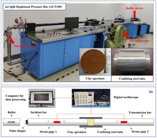 The dynamic impact experiment on unsaturated clay employed the SHPB apparatus, namely ALT1000. Figure 1 shows the photograph and schematic diagram of the SHPB setup. The incident and transmitted bars are made of aluminum, each measuring 2500 mm in length and 50 mm in diameter. The gas pressures (0.05~0.25 MPa) can be adjusted using an air compressor and pneumatic value, thereby controlling the striking velocity of the bullet (400 mm in length) and achieving various loading rate conditions. Moreover, a cylindrical tube made of 4030 steel was used to apply passive confinement on the soil specimen. The inner and outer diameters of the cylindrical tube are 50.1 mm and 55.1 mm, respectively. The modulus and Poisson’s ratio of the steel are 195 GPa and 0.28, respectively. A rubber disk with a thickness of 2.0 mm and a diameter of 45 mm was employed as a pulse shaper to mitigate high-frequency oscillations and dispersion effects. To reduce friction effects, a thin layer of petroleum jelly was applied between the soil specimen and the inner wall of the steel tube.