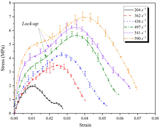 Figure 3 shows the stress–strain curves of unsaturated clay at strain rates ranging from 204 s−1 to 590 s−1. Since soil is a non-homogeneous material and the applied gas pressure cannot be precisely controlled by the air compressor and pneumatic value, impact tests at each gas pressure were repeated at least 3 times for self-calibration. Error bars were added in Figure 3 to indicate the data scatter extent for repeated tests. Although there is some discrepancy for repeated tests, the stress–strain curves obtained at the same gas pressure exhibit good consistency. According to Figure 3, the dynamic stress–strain curve of unsaturated clay under passive confinement demonstrates three distinct stages: