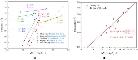 Figure 4a shows the calibrated CS coefficients of various geomaterials [25,33,35,36,37]. The results indicate that the CS model is appropriate for representing strain rate dependency behavior of various materials with a large range of strain rate. Figure 4b shows that when the strain rate of unsaturated clay in the SHPB test is in the range of 204~590 s−1, the CS model agrees well with the measured data. In this case, the intercept C of 56 and slope P of 0.8 are determined in the CS formula of dynamic peak stress.