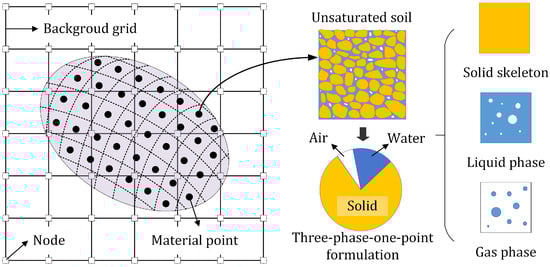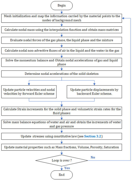 To balance computational cost and efficiency, the three-phase-one-point MPM formulation for unsaturated soil proposed by Yerro [43] was employed in this paper. Figure 5 shows the schematic diagram of MPM implementation for unsaturated soil. As shown in Figure 5, the unsaturated media are discretized by a certain number of material points (MPs), and each MP represents the mixture composed of solid, liquid, and gas phases. The detailed numerical procedure of the MPM algorithm at each time increment is summarized in Figure 6.